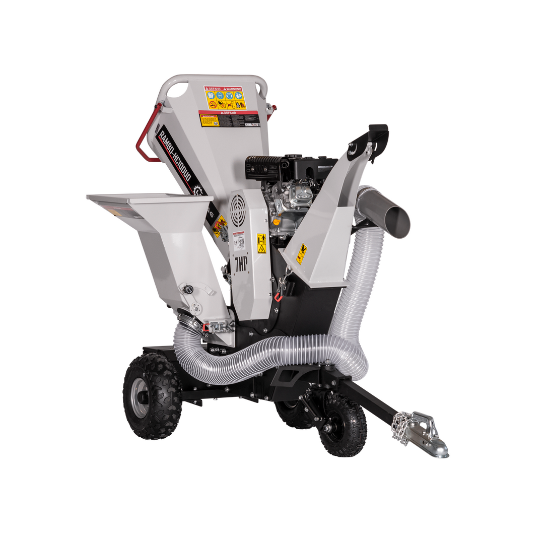 Der Lumag Benzin-Kombi-Häcksler RAMBO-HC10DUO ist eine Neuentwicklung mit 2 Trichtern und Saugschlauch. So ist es nun auch möglich mittels Saugschlach bzw. über den Trichter für Laub, Laub und andere Gartenabfälle zu verarbeiten. Über den Trichter für Astwerk zerkleinern Sie mühelos Astwerk bis zu einer Stärke von Ø 100 mm. Die großen Einfülltrichter ermöglichen eine komfortable Bedienung und das integrierte Fahrwerk mit Stollen-Luftbereifung sowie abnehmbarer Deichsel sorgt für schnelles und einfaches Umsetzen, auch in unwegsamen Gelände. Die verstärkte, professionelle Duplex-Messertrommel mit erhöhter Einzugskraft verarbeitet auch widerspenstiges Material problemlos. Der verstellbare Auswurfklappe ermöglichen eine individuelle Einstellung des Auswurfs. Der Einfüll- und der Auswurftrichter können zum Reinigen der Messertrommel einfach zur Seite geklappt werden. Der RAMBO-HC10DUO ein zuverlässiger und leistungsstarker Helfer für den professionellen gewerblichen und privaten Einsatz.
