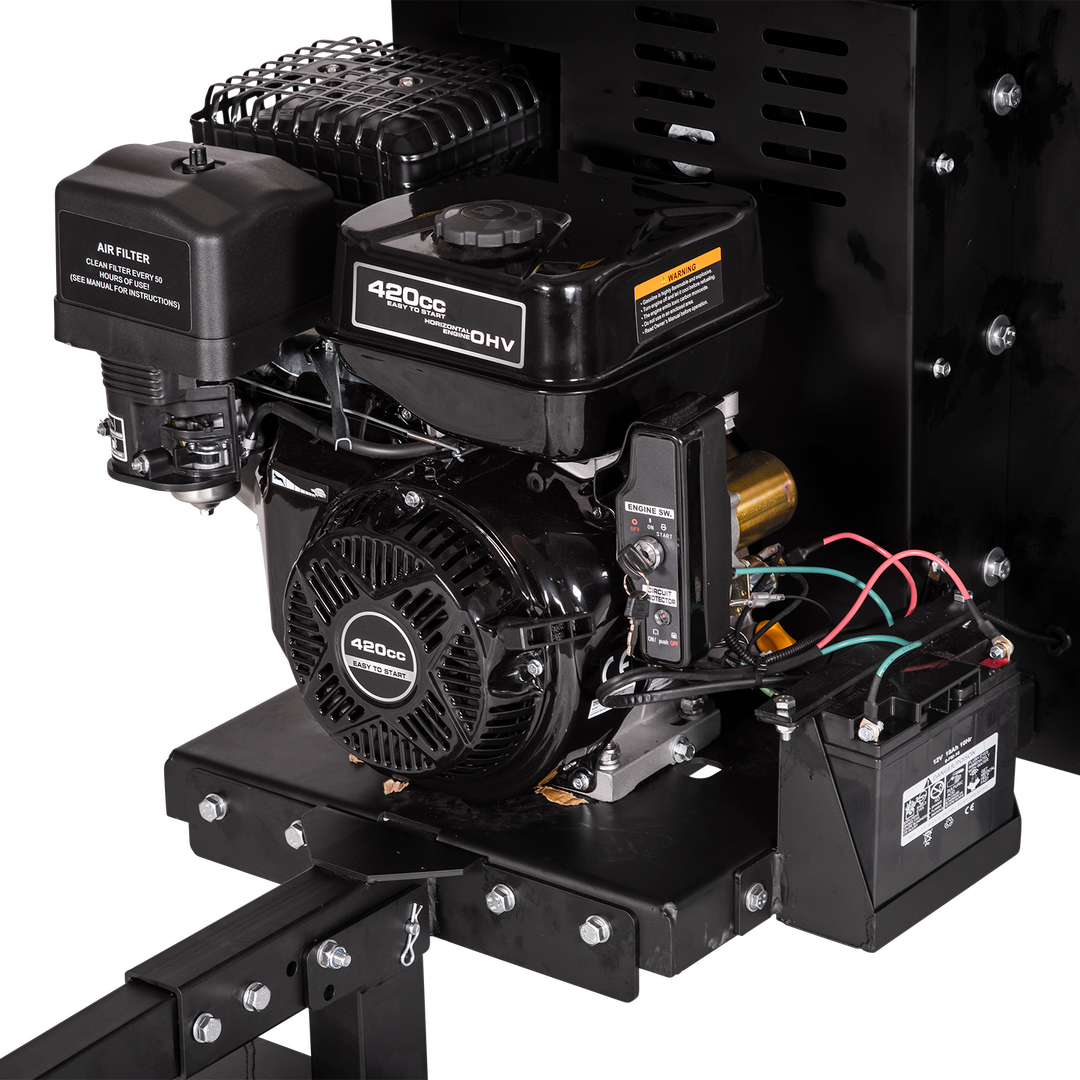 Der Lumag Benzin-Kombihäcksler RAMBO-HC15L ist unseren Kombigerät unter den Häckslern! Durch das integrierte Fahrwerk mit Deichsel ist ein schnelles und einfaches Umsetzen möglich. Der RAMBO-HC15L verfügt über vier (2x groß + 2x klein) Messer und zwei Gegenmesser und zerkleinert so auch widerspenstiges Material und dünneres Astwerk bis zu einem Durchmesser von 100 mm. Zusätzlich sorgen 22 bewegliche Klingen auf dem Scheibenrad dafür, dass das bereits gehäckselte Schnittgut nochmals zerkleinert wird, um einen noch feineren Auswurf zu erhalten. Der Auswurfschacht ist 120° drehbar. Ein weiteres praktisches Merkmal ist der Einfülltrichter dieser kann zum Reinigen der Messerscheibe zur Seite geklappt werden kann. Der RAMBO-HC15L ist ein leistungsstarkes Gerät, das sich ideal für den professionellen Einsatz eignet.